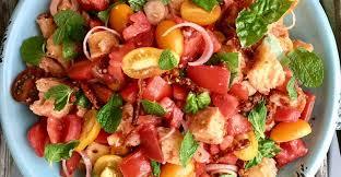 This is the classic bread salad: tomatoes make the “dressing,” the bread soaks it up, the basil perfumes everything. Use truly day-old bread (or quick-dry your own) so it softens without turning mushy.