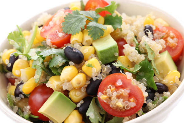- Combine quinoa, beans, corn, tomato, scallions, cilantro, and dressing.